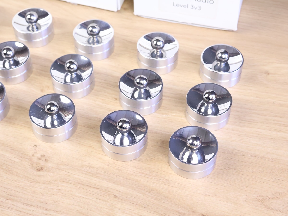 Six sets of three Ingress Audio Level 3v3 Isolation System audio tuning feet in a very good condition. Hand-polished aluminum bases and Grade 10 steel bearings ensure optimal performance. Isolate your components from harmful vibrations that muddy your sound. Experience a wider soundstage, enhanced detail, and tighter bass response.