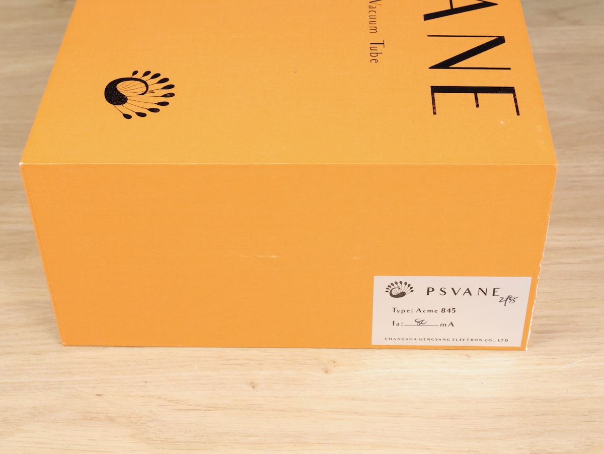 One pair of Psvane ACME 845 Matched Pair of audio Vacuum Tubes in a fantastic condition. They have about 50 hours of playing time only.